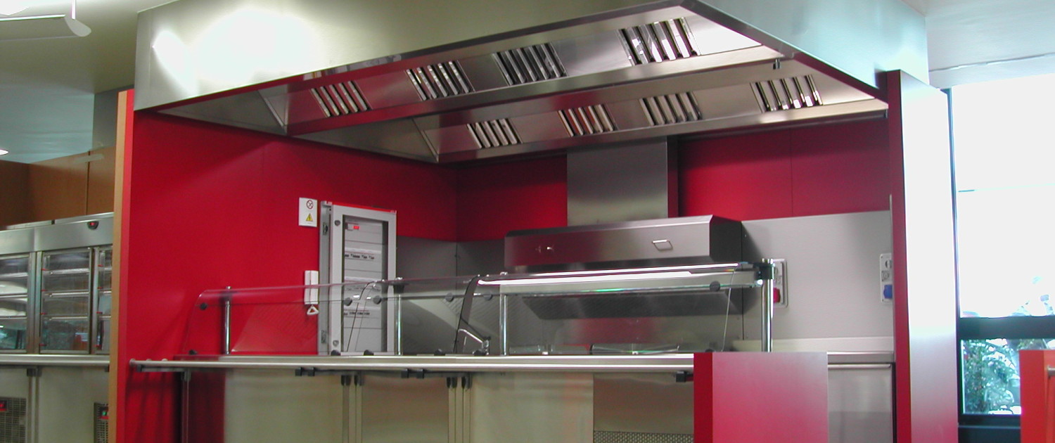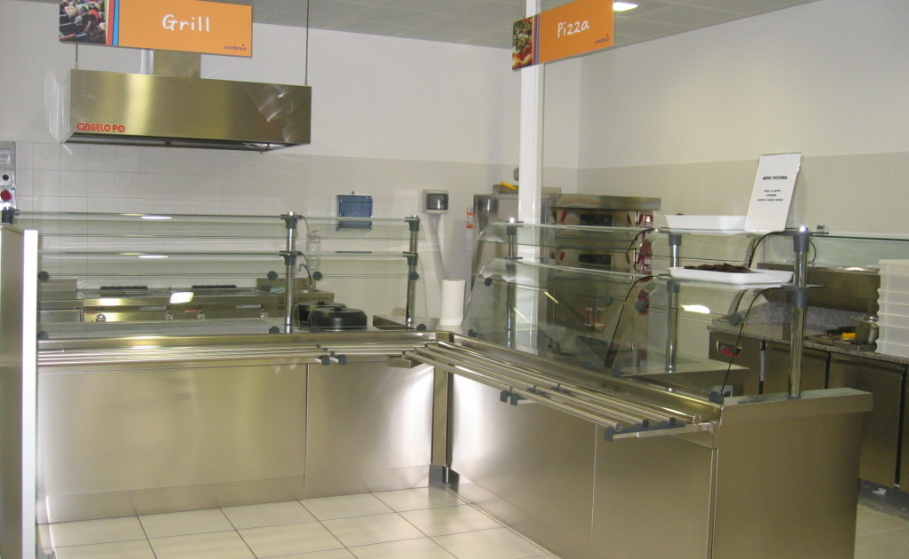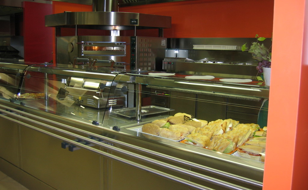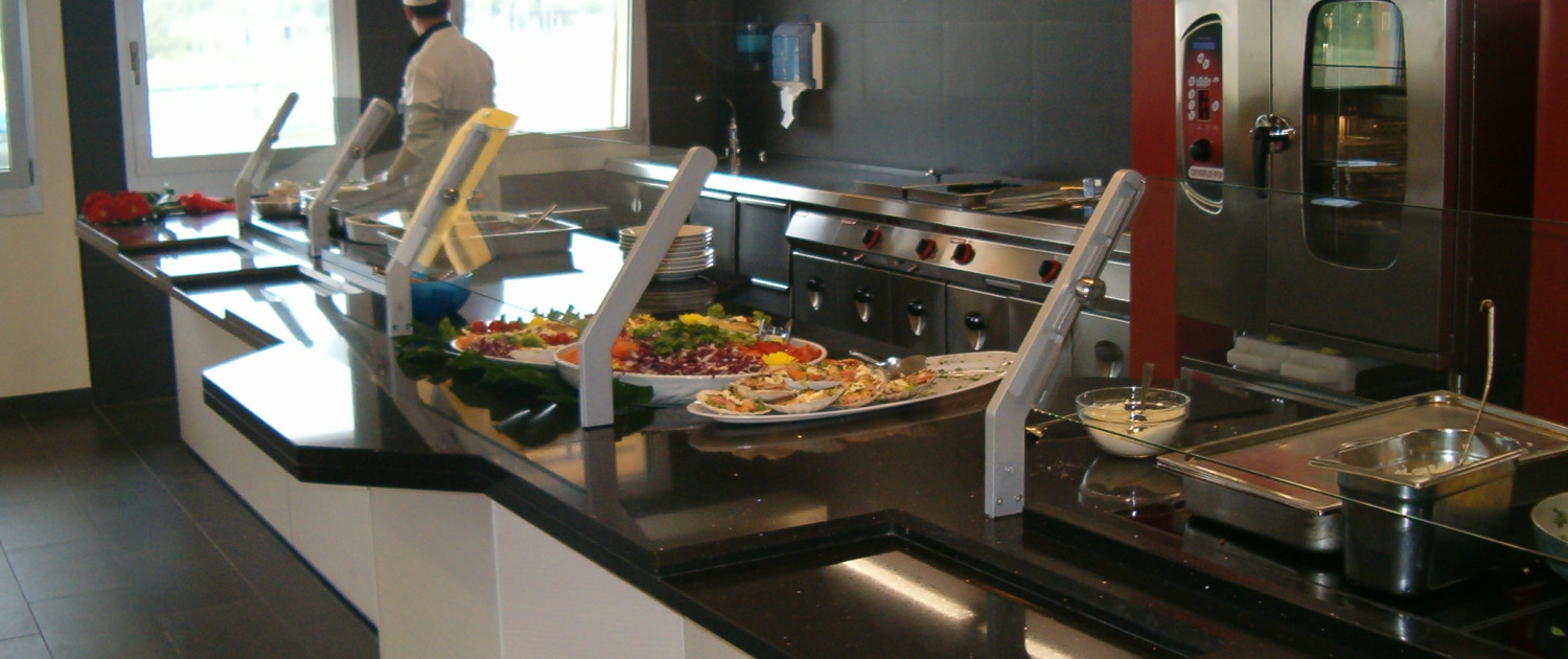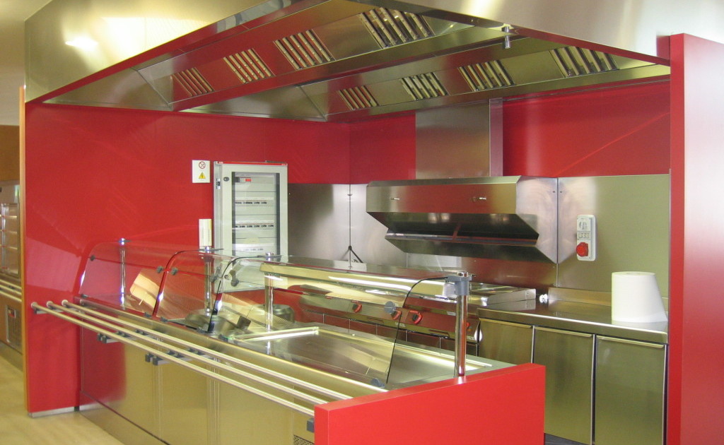 Le linee di distribuzione possono inoltre contenere elementi di cottura (grazie all’inserimento di moduli self-service particolare costruzione) al fine di poter realizzare delle aree specifiche di cottura espressa (“corner primi piatti”, “corner griglia” o “corner pizza”). Le suddette aree di cottura cc.dd. “in linea” disporranno di uno specifico impianto di aspirazione, a seconda dei casi, indipendente o collegato all’impianto di estrazione fumi della cucina principale che potrà consistere in semplici cappe di aspirazione o in specifici SOFFITTI ASPIRANTI A PLAFONI INERZIALI (così come illustrato di seguito nell’ambito degli Esempi di realizzazioni effettuate).